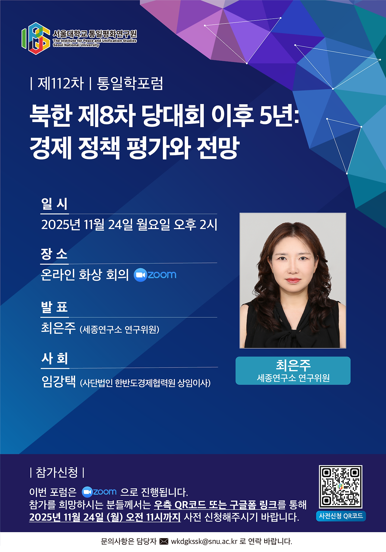 서울대학교 통일평화연구원에서 최은주 세종연구소 연구위원을 모시고 < 북한 제8차 당대회 이후 5년: 경제 정책 평가와 전망 >이라는 주제로 [제112차 통일학포럼]을 개최합니다.